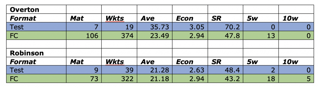 Few would argue that Overton and Robinson are not amongst the best seam bowlers in domestic cricket over the last 3 or 4 years. Both have ‘earned’ the right to play for England through their first-class records, yet curiously both appear to lack the stamina to bowl above 80 miles per hour in their second or third spells of test cricket.
