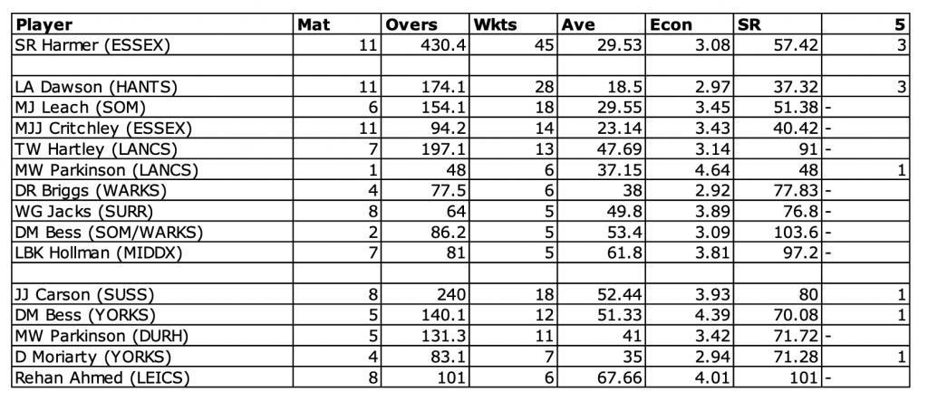I have included Harmer for context. He is the only specialist spinner to have played all 11 games this year so far. Mason Crane and Amar Virdi, both England Lions, have played none.
